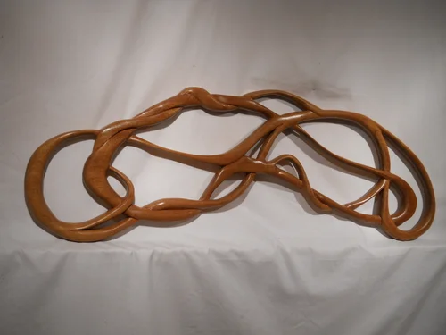 This carving, 21" x 38", invites the hand to follow its smooth curves. It winds and weaves as you travel from the center to the curly maple rim.