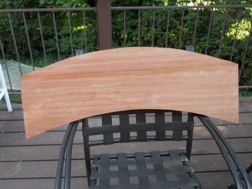 I wanted to create a piece that had an overall arc so I started by cutting an arc out of the bottom and gluing it to the top. You can see the glue line. This piece is 1" thick mahagony, about 36" wide by 14" high.