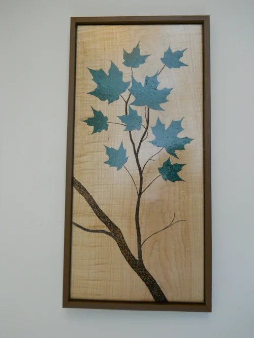 This wall hanging was created by inlaying malachite dust to form the pine needles and wood burning the branches. It is on curly maple and measures 19" x 13".